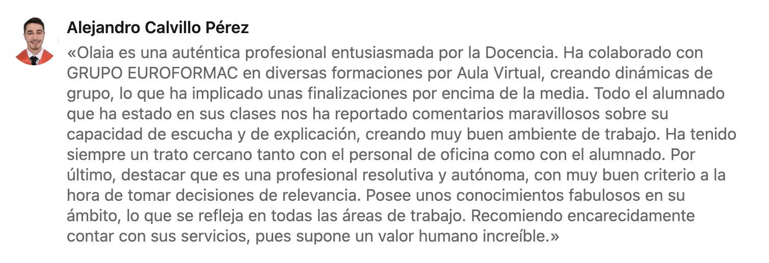 “Trabajar con Olaia me ha ayudado tanto a nivel profesional como personal.Gracias a su acompañamiento pude estructurar una estrategia clara y asertiva para lanzar mi curso online, un proyecto que llevaba tiempo posponiendo.Olaia creyó en mí desde el primer momento y me ayudó a avanzar con empatía, confianza y dirección.Su metodología es práctica, cercana y consigue que cada sesión te impulse a pasar a la acción.Una experiencia transformadora que volvería a repetir sin dudarlo.”